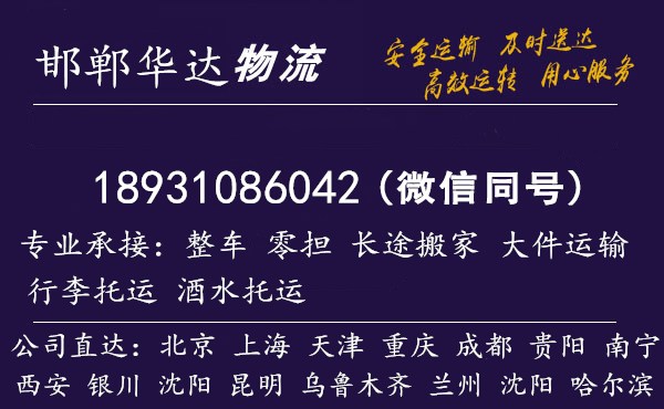 邯鄲到太原物流公司運費查詢:18931086042華達物流以一流的服務體系,本著安全,準時,互友,互惠的原則贏得市場,只要一個電話,一切由我公司操辦, 望廣大新老客戶給予大力支持、與我公司聯絡,我們將竭誠為您提供一切方便,歡迎來人來電咨詢!